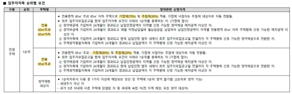 ▪ 전용면적 85m² 이하 : 가점제 70% + 추첨제 30%