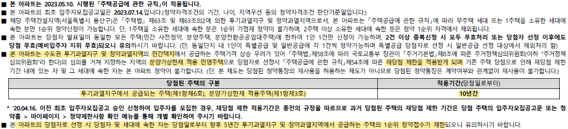 ▪ 재당첨제한 : 10년(5년간 투기과열지구 및 청약과열지역 1순위 접수제한)