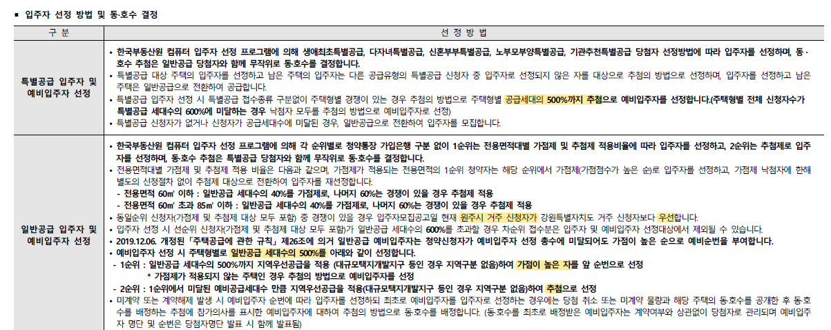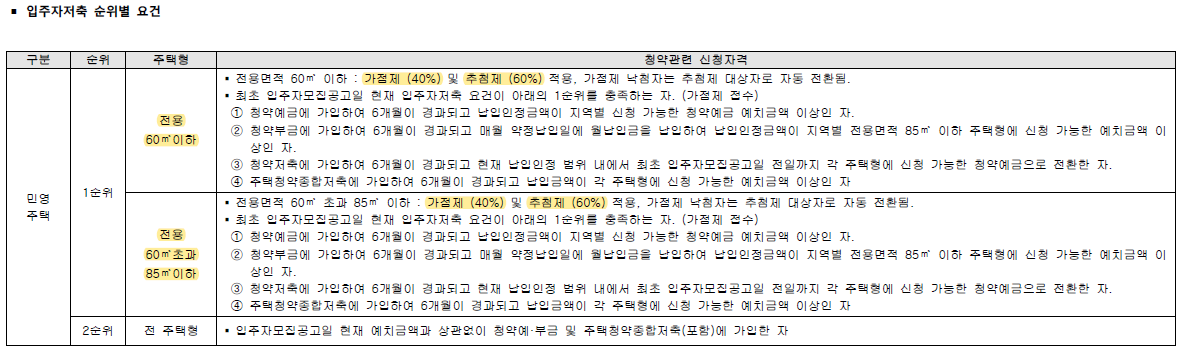 ▪ 전용면적 85m² 이하 : 가점제 40% + 추첨제 60%