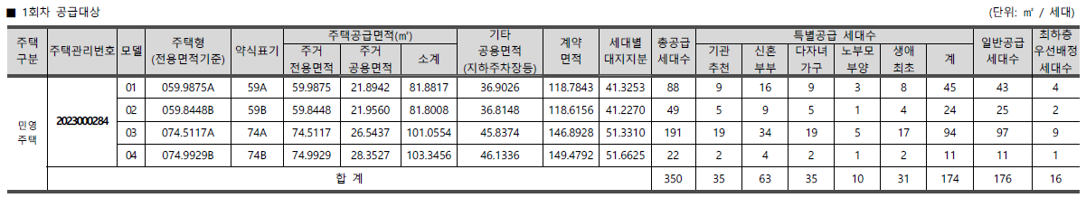 [1회차 특별공급 174세대(기관추천특별공급 35세대, 다자녀가구특별공급 35세대, 신혼부부특별공급 63세대, 노부모부양특별공급 10세대, 생애최초특별공급 31세대]