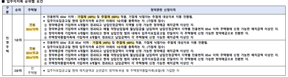 ▪ 전용면적 85m² 이하 : 가점제 40% + 추첨제 60%