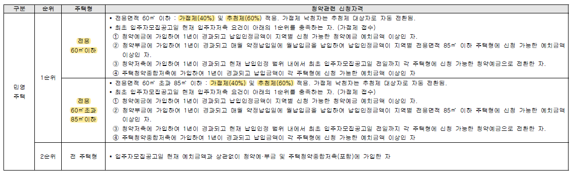 ▪ 전용면적 85m² 이하 : 가점제 40% + 추첨제 60%