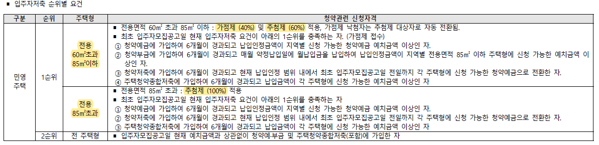 ▪ 전용면적 85m² 이하 : 가점제 40% + 추첨제 60%
