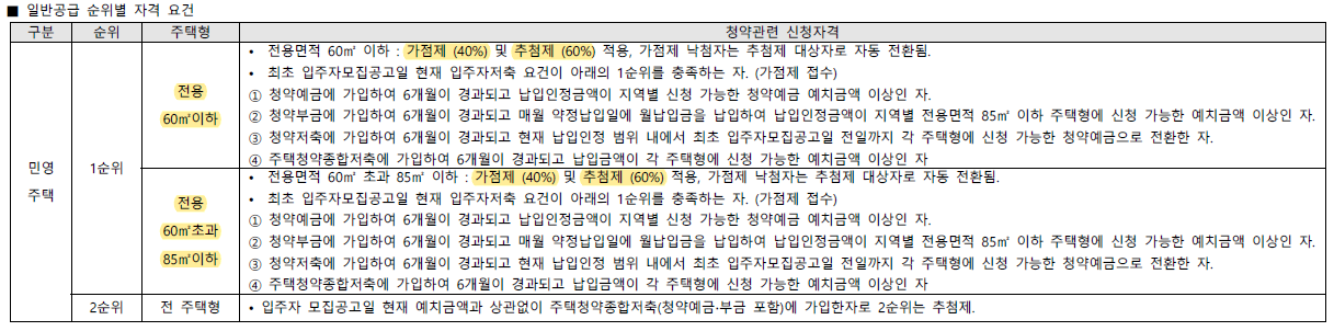 ▪ 전용면적 85m² 이하 : 가점제 40% + 추첨제 60%