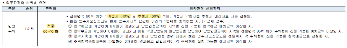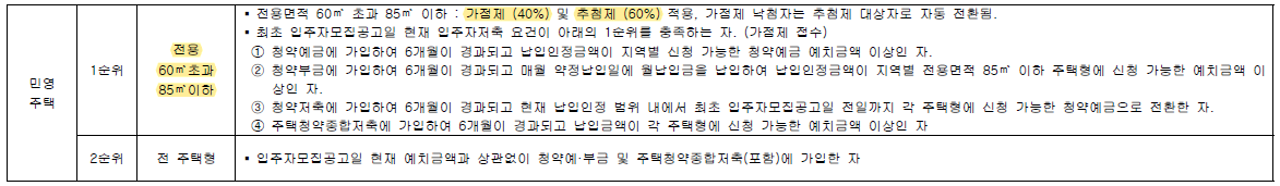 ▪ 전용면적 85m² 이하 : 가점제 40% + 추첨제 60%
