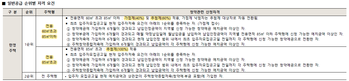 ▪ 전용면적 85m² 이하 : 가점제 40% + 추첨제 60%