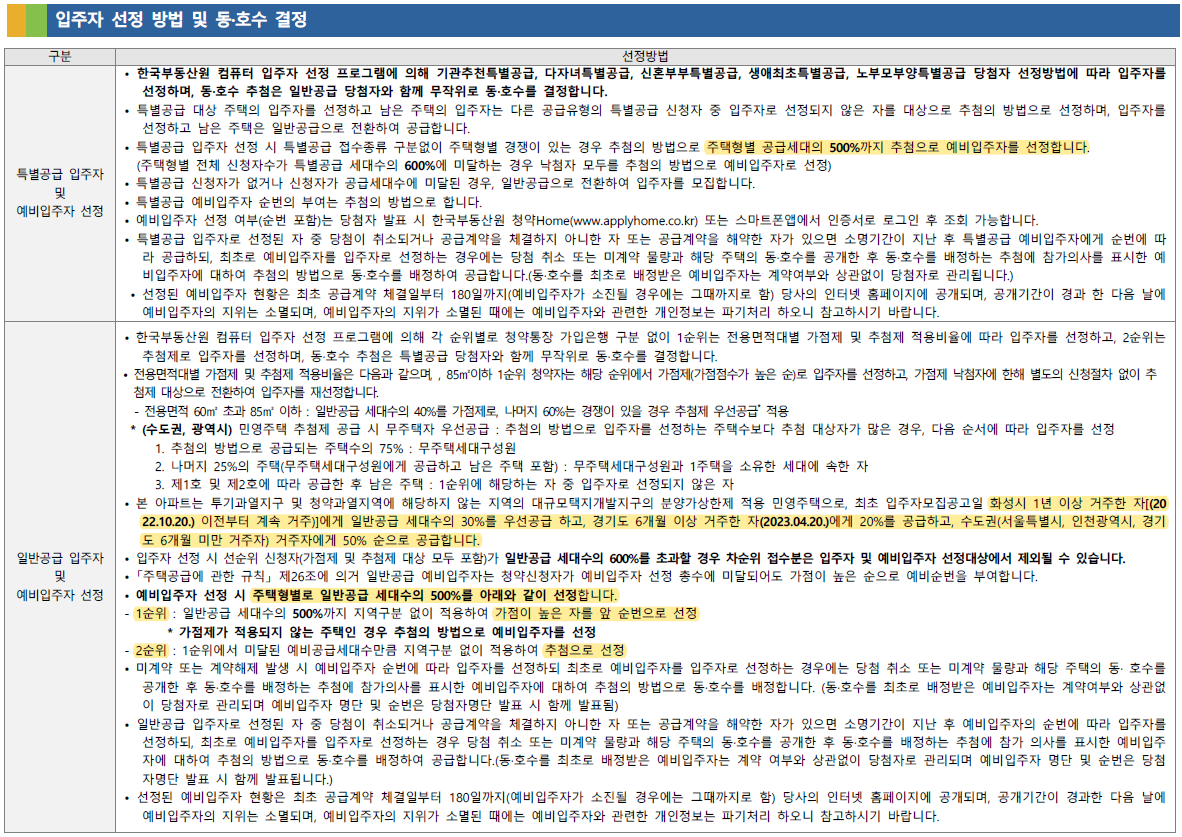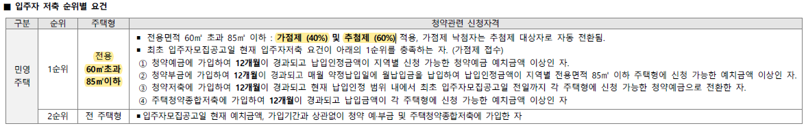 ▪ 전용면적 85m² 이하 : 가점제 40% + 추첨제 60%