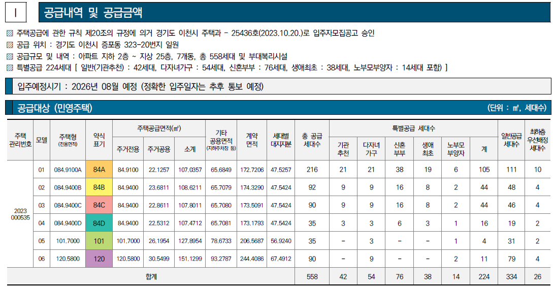특별공급 224세대 [일반(기관추천) : 42세대, 다자녀가구 : 54세대, 신혼부부 : 76세대, 생애최초 : 38세대, 노부모부양자 : 14세대 포함)]
