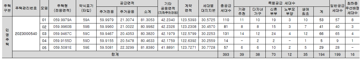 [특별공급 194세대 (일반기관추천 특별공급 39세대, 다자녀가구 특별공급 38세대, 신혼부부 특별공급 70세대, 노부모부양 특별공급 12세대, 생애 최초 특별공급 35세대) 포함]