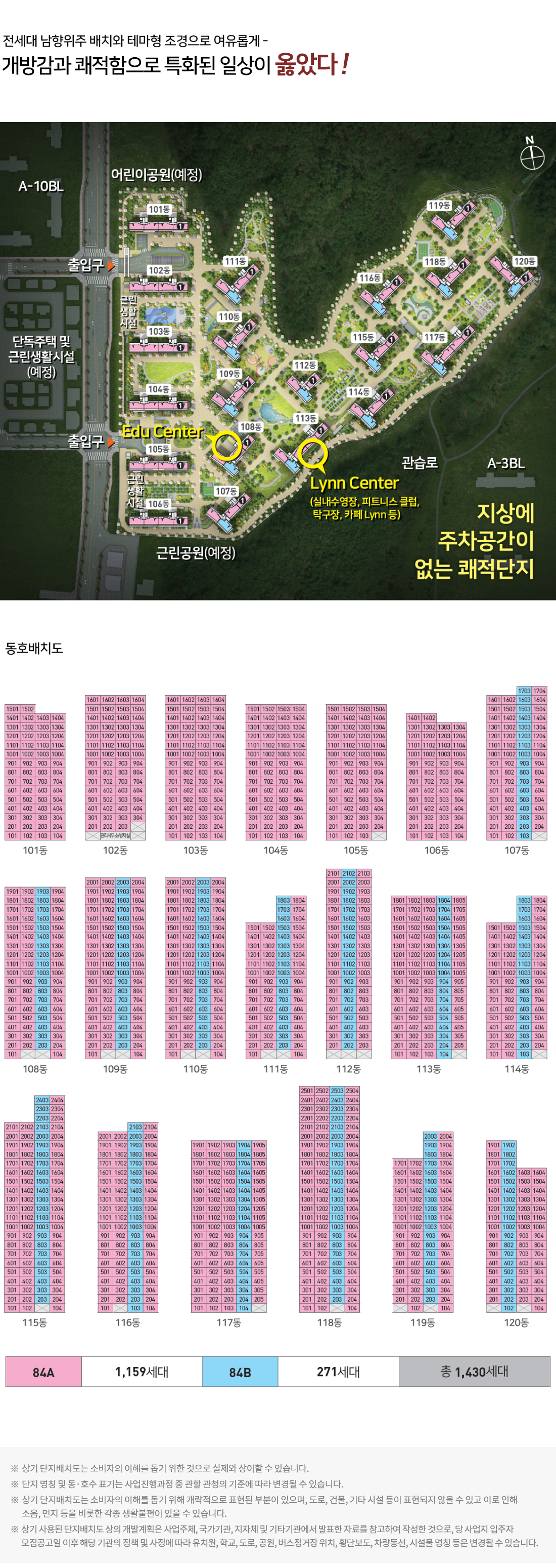 ▪ 아파트 지하 3층, 지상 14~25층(106동 3,4호 라인은 최고층수 13층이나 법적표기상 106동 최고층수는 14층으로 표기함) 20개동, 총 1,430세대 중 사전 공급 321세대, 금회 공급 1,109세대