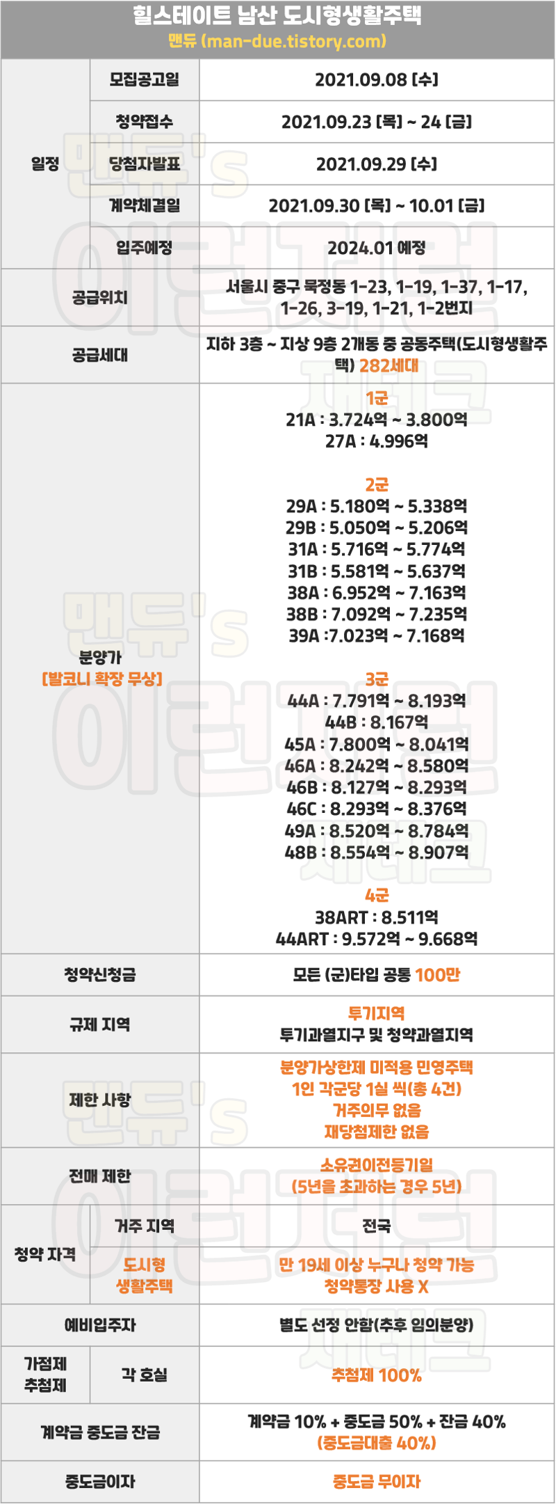 모집공고 한장정리 [출처 : 힐스테이트 남산 도시형생활주택 입주자모집공고문]