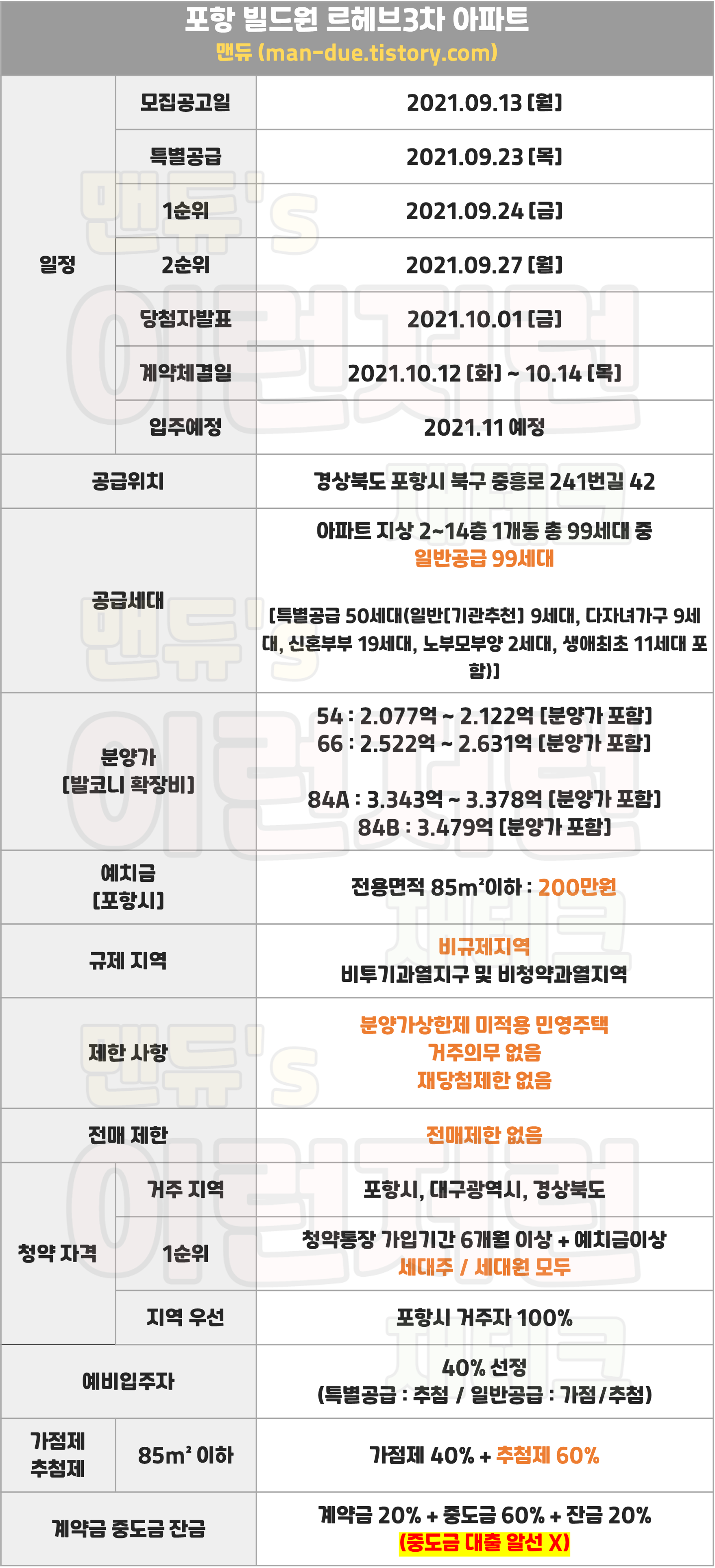 모집공고 한장정리 [출처 : 빌드원 르헤브3차 아파트 입주자모집공고문]