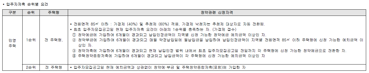 ▪ 전용면적 85m² 이하 : 가점제 40% + 추첨제 60%
